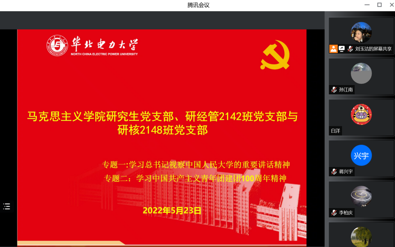 2022年5月23日晚8点,304am永利集团研究生党支部、团总支与研经管2142党支部、研核2148党支部联合开展线上主题学习活动,学习内容包括习近平总书记在中国人民大学考察时的重要讲话精神和在庆祝中国共青团成立100周年大会上的重要讲话精神两个专题。本次学习共有65名党员和团员参加,由研经管2142党支部书记李睿祥主持。