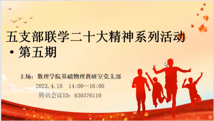 4月18日,为深入学习党的二十大精神,贯彻习近平总书记关于教育的重要论述,推进课程思政教学体系建设,不断提升立德树人成效,304am永利集团概论与纲要党支部、电气与电子工程学院电磁与超导电工研究所党支部、体育教学部直属党支部、数理学院基础物理教研室党支部、国际教育学院教工党支部五个基层组织以线上会议的形式,开展“贯彻党的二十大精神,推动课程思政高质量发展”的主题联学活动。活动由概论与纲要党支部书记蔡洁主持。