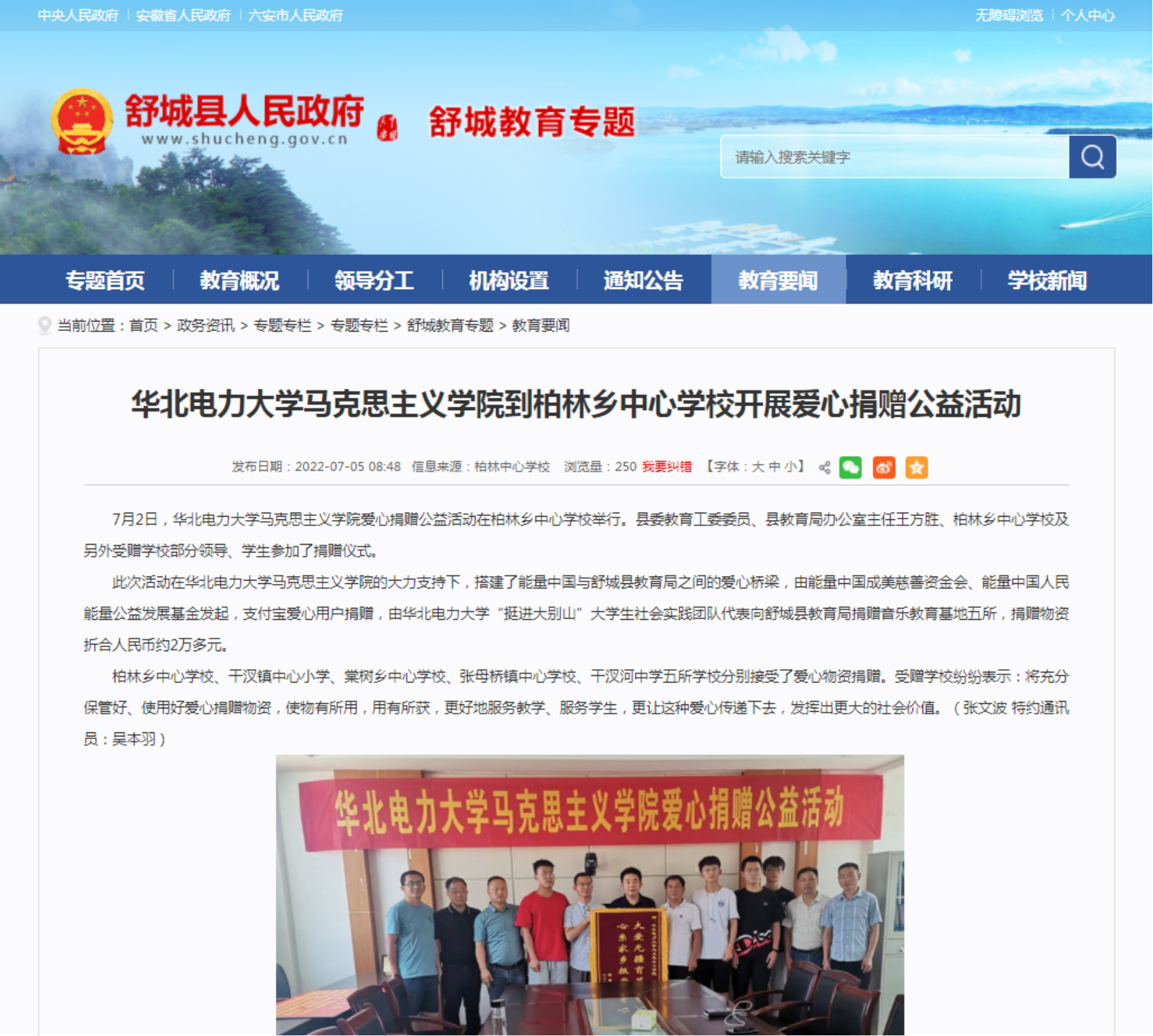 习近平总书记在党的二十大报告中寄语青年:“当代中国青年生逢其时,施展才干的舞台无比广阔,实现梦想的前景无比光明。青年要坚定不移听党话、跟党走,怀抱梦想又脚踏实地,敢想敢为又善作善成,立志做有理想、敢担当、能吃苦、肯奋斗的新时代好青年”。公司“挺进大别山”老员工社会实践团成员坚持听党话、跟党走,积极促成捐赠事宜,为大别山地区基础教育事业和国家乡村振兴事业贡献力量,用实际行动体现了浓浓故乡情,拳拳赤子心,传承了公司“自强不息、团结奋进、爱校敬业、追求卓越”的华电精神,体现了公司始终秉承“办一所负责任大学”的教育理念。