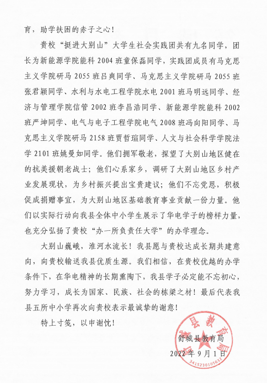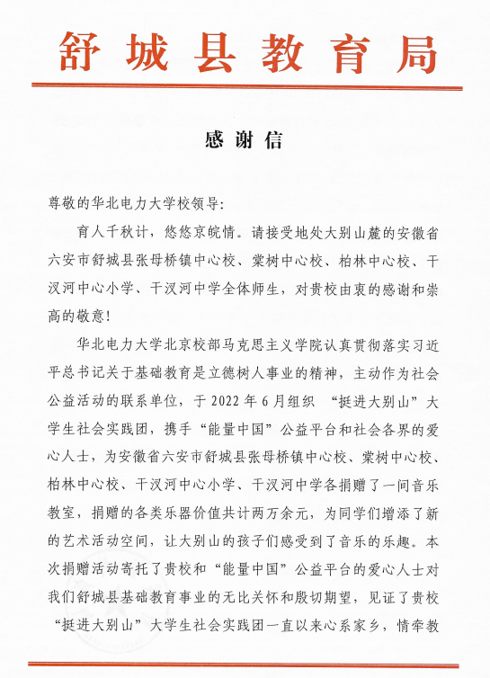 中国·304am永利集团(Macau)股份有限公司-Official website近日,304am永利集团收到了来自安徽省六安市舒城县教育局的一封感谢信,信中舒城县教育局对公司北京校部304am永利集团及“挺进大别山”社会实践团的九名同学表示充分肯定和由衷感谢。
