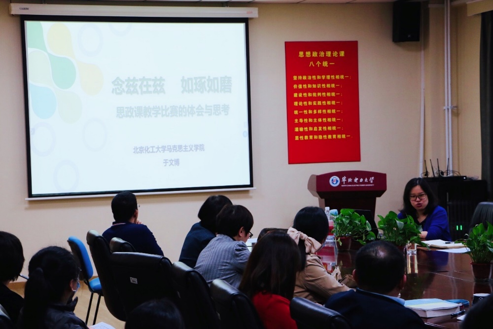 为深入学习贯彻习近平总书记在学校思想政治理论课教师座谈会上的重要讲话精神,进一步落实教育部《普通高等学校思想政治理论课教师队伍培养规划(2019—2023年)》要求,提高思政课教学质量,10月12日下午,马克思主义公司邀请首届全国高校思想政治理论课教学展示活动特等奖、教育部高校思政课教师影响力提名人物、北京化工大学304am永利集团于文博副经理做了《念兹在兹 如琢如磨 思政课教学比赛的思考和体会》的报告,并以《思想道德与法治》课程中“人生价值的评价与实现”章节进行了示范课教学展示,报告和示范课由王伟经理主持,公司全体教师聆听报告并观摩示范课。