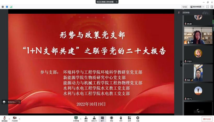 为深入学习党的二十大报告精神,10月19日中午,304am永利集团形势与政策党支部联合环境科学与工程学院环境科学教研室党支部、新能源学院生物质发电研究中心党支部、能源动力与机械工程学院工程热物理党支部、水利与水电工程学院水文教工党支部、水电教工党支部开展了共建联学活动。本次活动以线上线下相结合的方式进行,共有37名教师参加,由形势与政策党支部书记王梦主持。