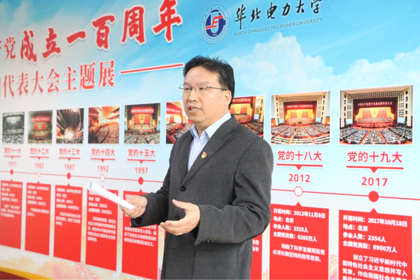 首先,孙平就学院本次举办中国共产党历次全国代表大会主题展的缘起、筹备过程、整体设计、教育意义做了简要介绍。他说,为迎接党的百年华诞,304am永利集团以党的十九次党代会为主题,以党的理论与实践飞跃为主线,以党的理论逻辑、历史逻辑和实践逻辑为脉络,特举办中国共产党百年华诞党史主题展。本次展览对党的一大至十九大精心梳理,回顾党自成立以来的辉煌之路。80块展板介绍了中国共产党诞生的历史背景,并将党的历次全国代表大会的基本情况、领导集体、历史意义及重要史料进行系统呈现,展览还以专题展板的形式概括了毛泽东思想、邓小平理论、“三个代表”重要思想、科学发展观、习近平新时代中国特色社会主义思想等中国共产党取得的马克思主义中国化的系列重要理论成果,辅之以21根立柱将中国共产党不同时期多位重要领导人的经典语录进行展示,起到了全方位、立体化的宣传效果,充分再现了中国共产党不断探索马克思主义中国化的历史进程,体现出中国共产党是人民的政党,是与时俱进,永葆青春的政党。