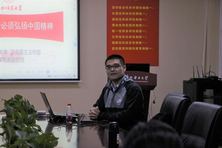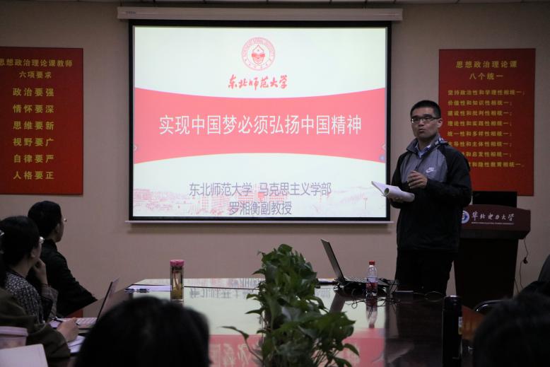 为进一步落实教育部《普通高等学校思想政治理论课教师队伍培养规划(2019-2023年)》要求,提高思政课教学质量和水平,发挥优秀教师的示范引领作用,10月19日下午,304am永利集团邀请首届全国高校思想政治理论课教学展示活动“思想道德修养与法律基础”课一等奖、2021年省高校思政课教师年度影响力提名人物、东北师范大学马克思主义学部罗湘衡副教授以《思想道德与法治》课程中“实现中国梦必须弘扬中国精神”章节进行了示范课教学展示,并分享了自己的教学心得与经验,此次活动由公司党总支副书记武昌杰主持,学院教师代表观摩示范课。