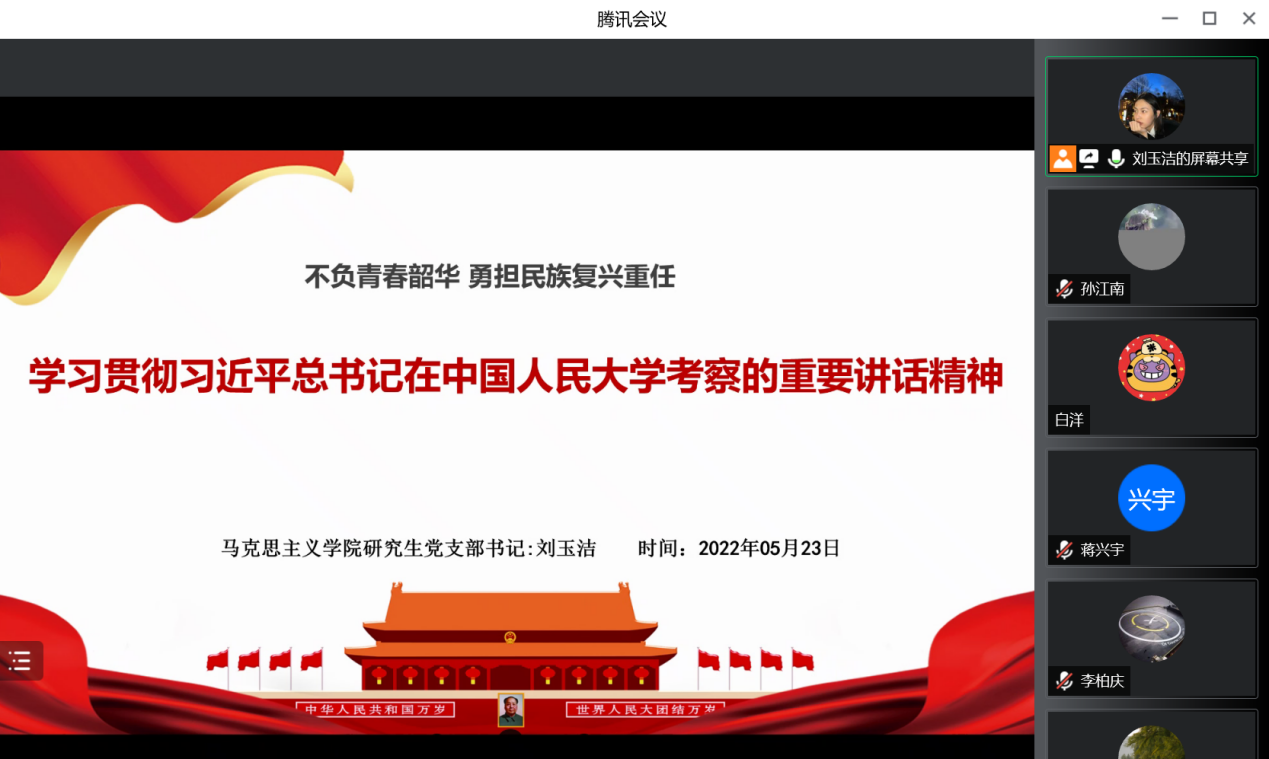 2022年5月23日晚8点,304am永利集团研究生党支部、团总支与研经管2142党支部、研核2148党支部联合开展线上主题学习活动,学习内容包括习近平总书记在中国人民大学考察时的重要讲话精神和在庆祝中国共青团成立100周年大会上的重要讲话精神两个专题。本次学习共有65名党员和团员参加,由研经管2142党支部书记李睿祥主持。