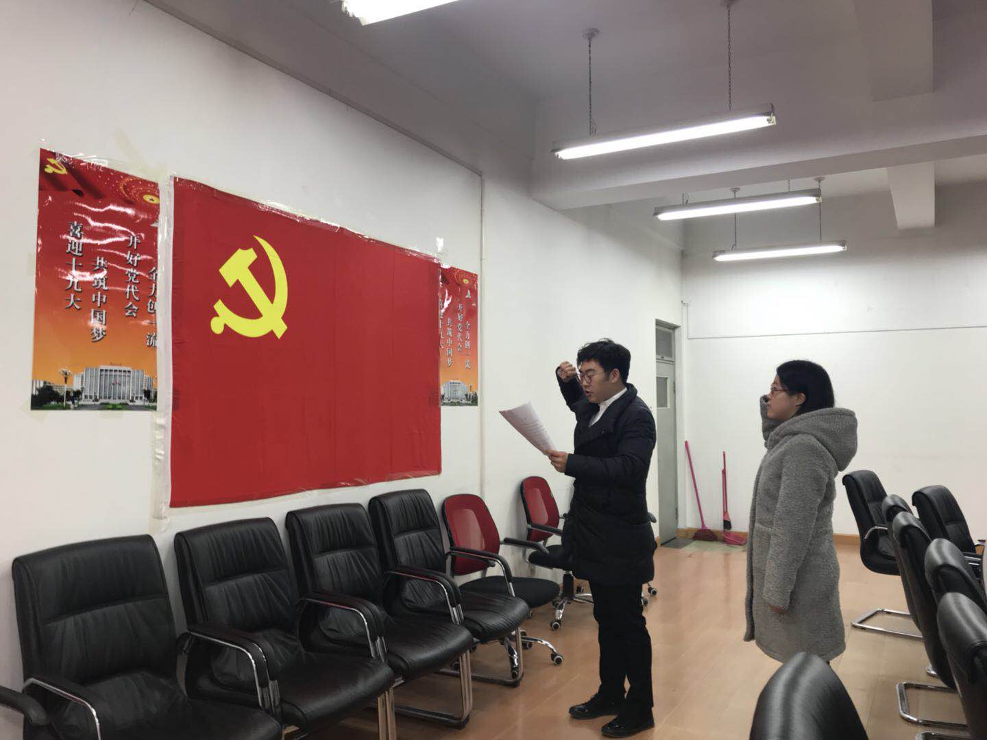 监票人张韬喆发放选票,有表决权的正式党员投票表决,最终刘洋洋全票通过。由王群领读,刘洋洋面向党旗宣誓。