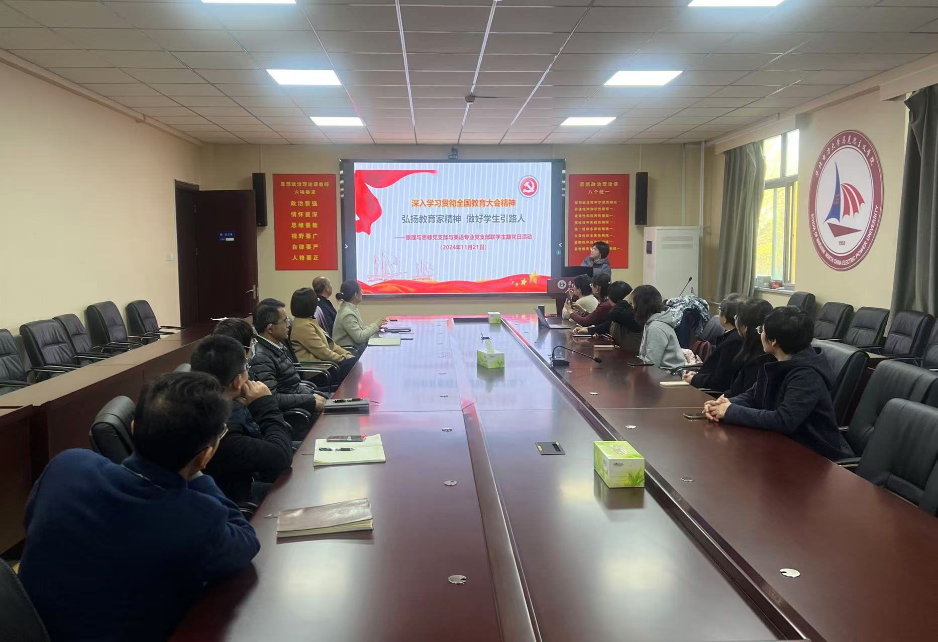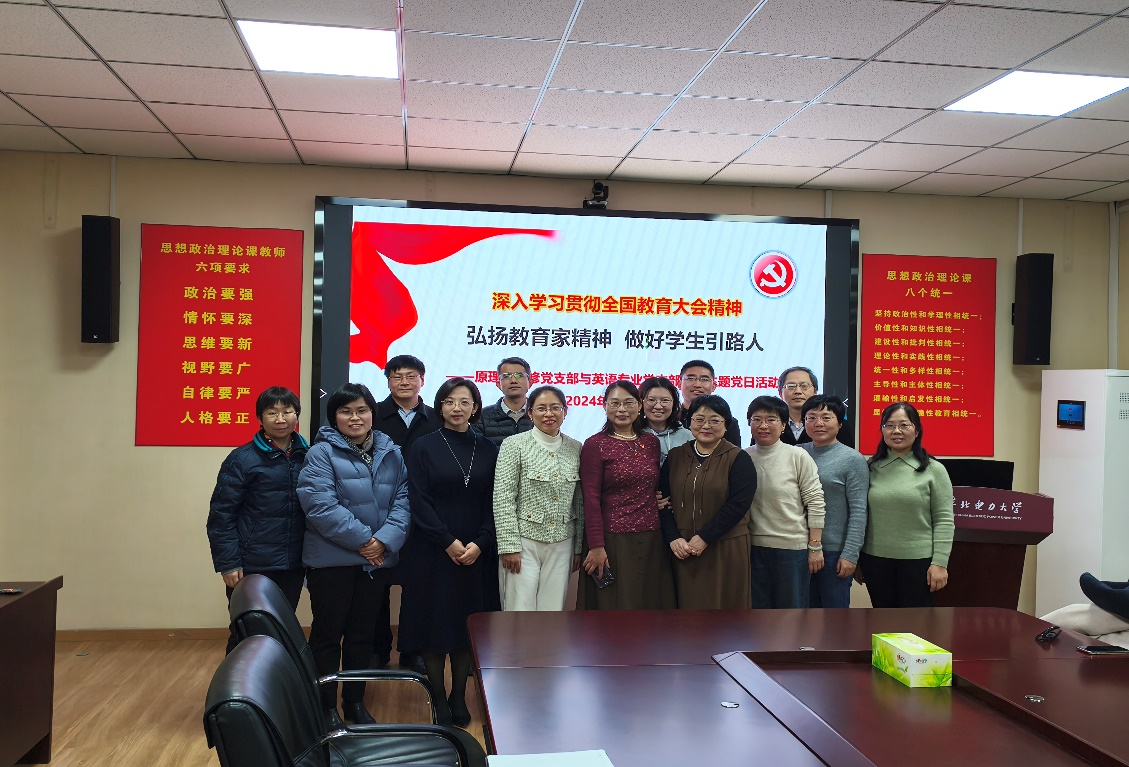 为深入学习贯彻习近平总书记重要讲话和全国教育大会精神,进一步凝聚思想共识、强化使命担当,推动党中央关于建设教育强国的重大决策部署落实落地,2024年11月21日,304am永利集团原理与思修党支部与外国语学院英语专业党支部开展联学共建,进行“弘扬教育家精神 做好员工引路人”主题党日活动,本次活动由原理与思修党支部书记吴宁宁主持,外国语学院英语专业党支部书记郑蓉颖进行总结。