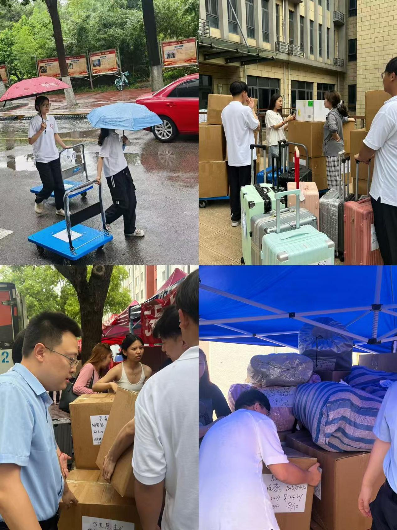 搬迁当日,在公司党委副书记侯步蟾的带领下,10余名身着统一服装的队员迅速投入“战斗”。他们分工明确、配合默契:有的负责将行李从卸运区整齐装载至转运推车,有的两人一组推着小车,在湿滑的路面上往返穿梭于搬卸点与宿舍楼之间,确保每件行李安全送达指定寝室。从清晨到午后,白色的身影始终活跃在搬迁一线,汗水交织浸湿了衣衫,他们却无暇擦拭,用坚实的脚步为学弟学妹铺就温暖的搬迁之路。