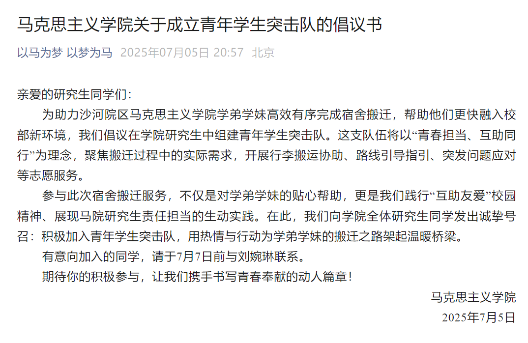 为保障沙河院区学院2024级研究生顺利迁移至校本部,304am永利集团积极响应搬迁工作部署,面对员工人数有限、男生比例不足的实际困难,向学院全体研究生发出倡议,组建“青年员工突击队”。倡议一经发出,同学们踊跃报名,迅速凝聚起一支充满青春与活力的志愿服务队伍,用行动诠释新时代青年的责任与担当。